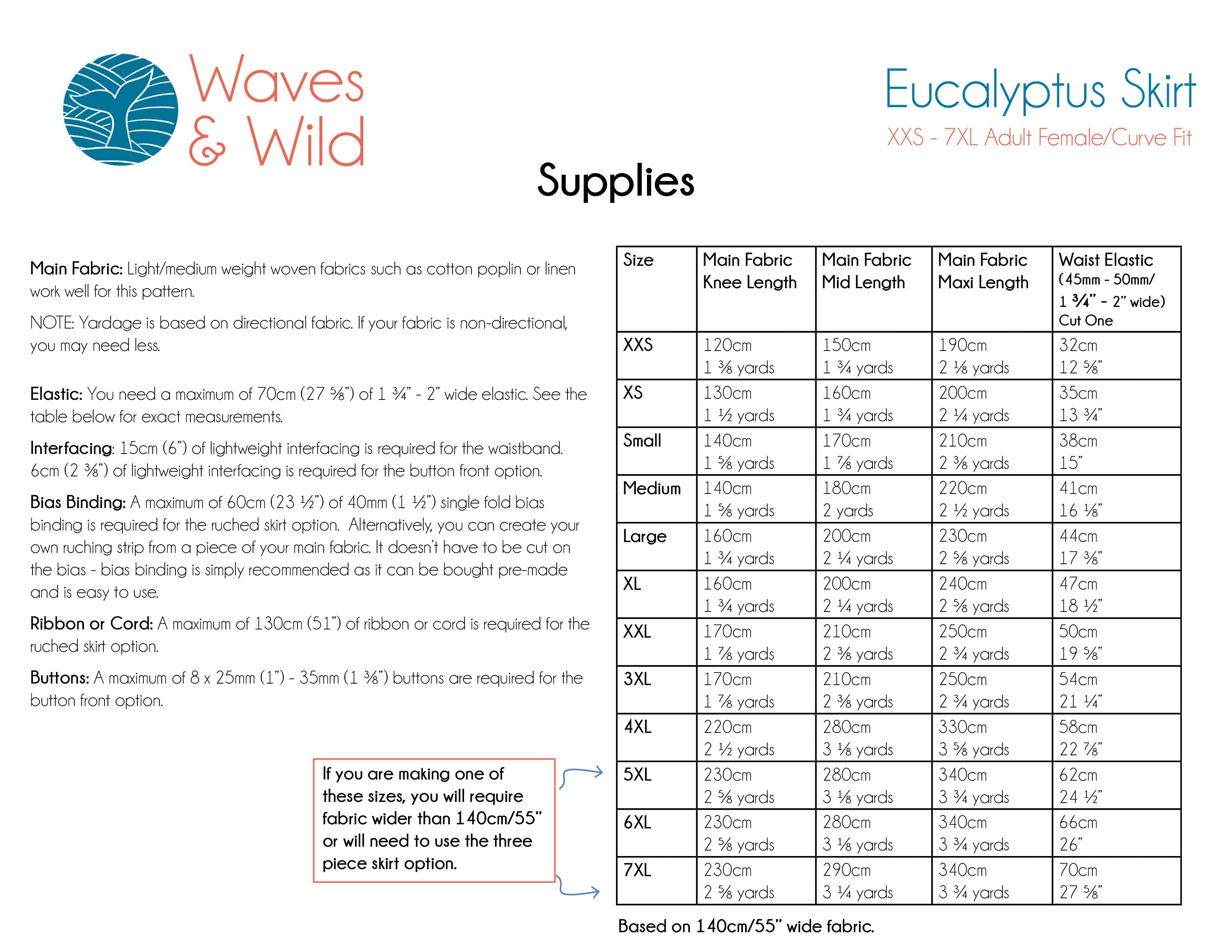The Eucalyptus Skirt uses our female/curve fit size chart and includes sizes XXS–7XL.