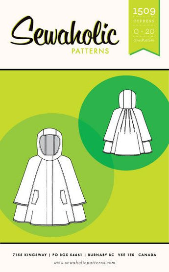 Look forward to rainy days with our Cypress Cape pattern! It's perfect for cycling, dog-walking, and long walks in the rain. Wide semi-circular sleeves allow you to easily stretch your arms and reach in front, with pleats at centre back for extra mobility. A hood keeps you dry in wet weather.