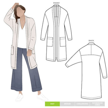 This long-line fashionable cardigan sewing pattern is a must have addition to your wardrobe.