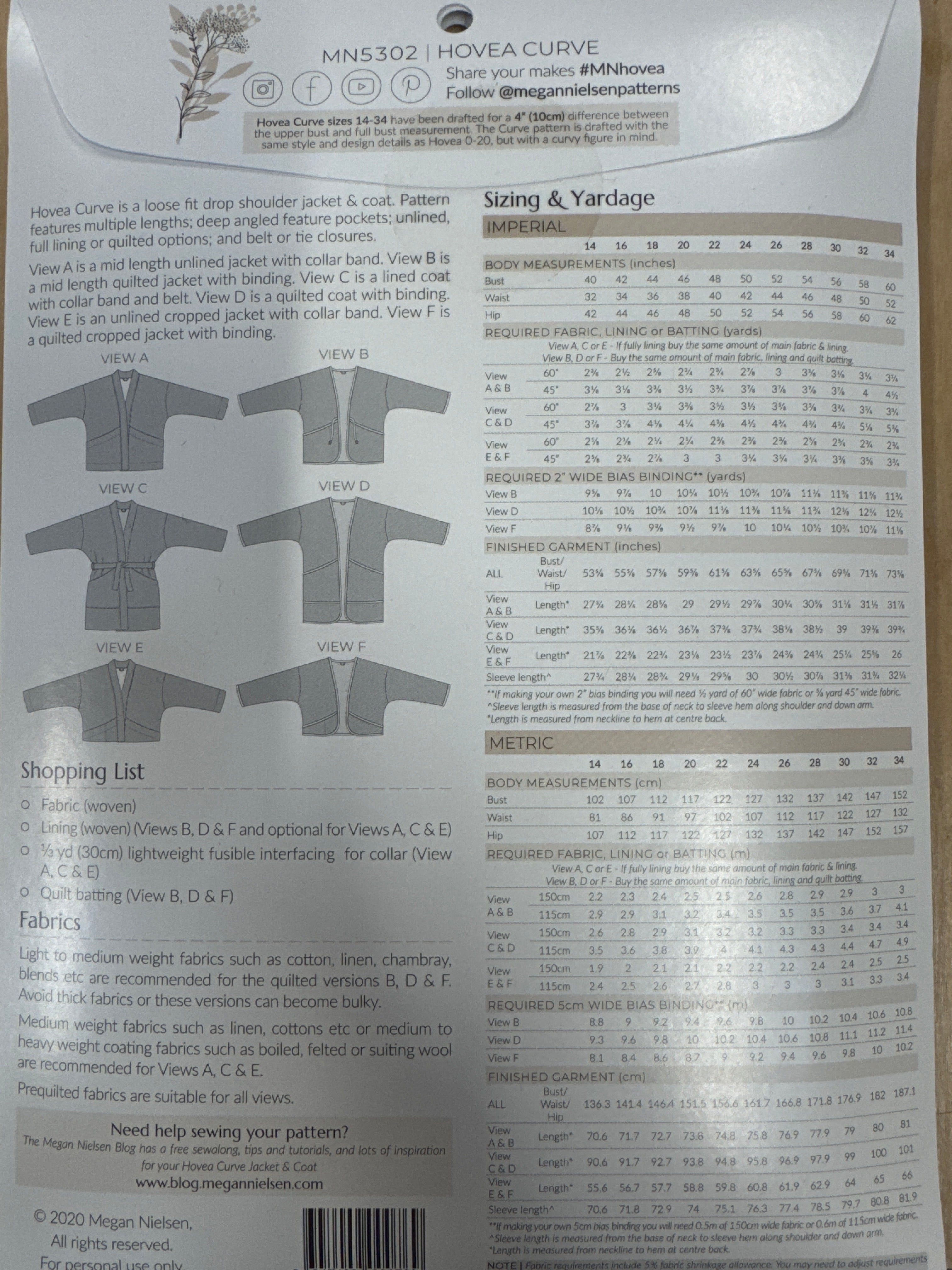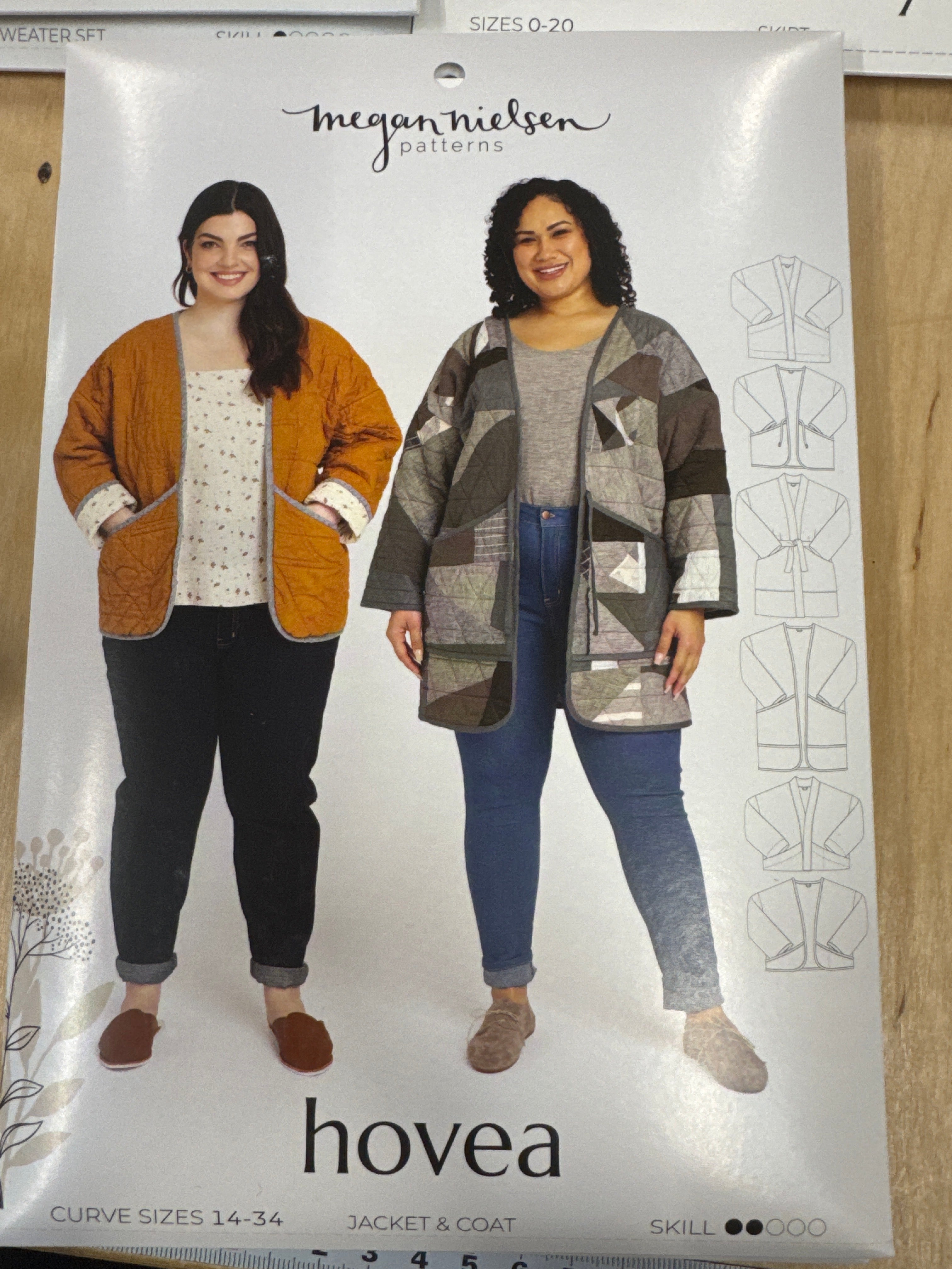 Hovea is a loose fit Drop shorter jacket and coat. Pattern and features multiple lengths; deep angles feature pocket; unlined, full lined or quilted options; and belt or tie closures.