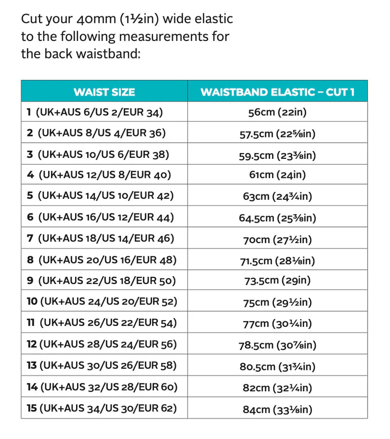 - 40mm (1 1/2in) wide elastic – see the image of the back cover for the length required for your size
