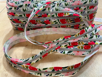 Flowers on White with Silver Teeth Continuous Zipper Tape