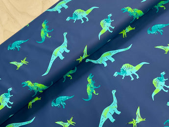 Green Dinos on Denim PU Raincoat Fabric