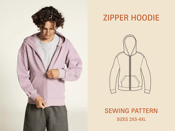 The Zipper Hoodie is a classic hooded sweatshirt with a front zipper. The shoulder seam is dropped and rotated forward. It has a kangaroo pocket, and the sleeves and hem are finished with ribbing. The pattern also includes the option to make a sleeveless version.