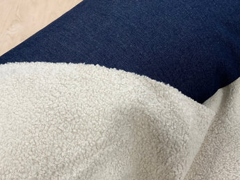 Heavy weight 100% Cotton denim with 100% Cotton curly teddy fleece back