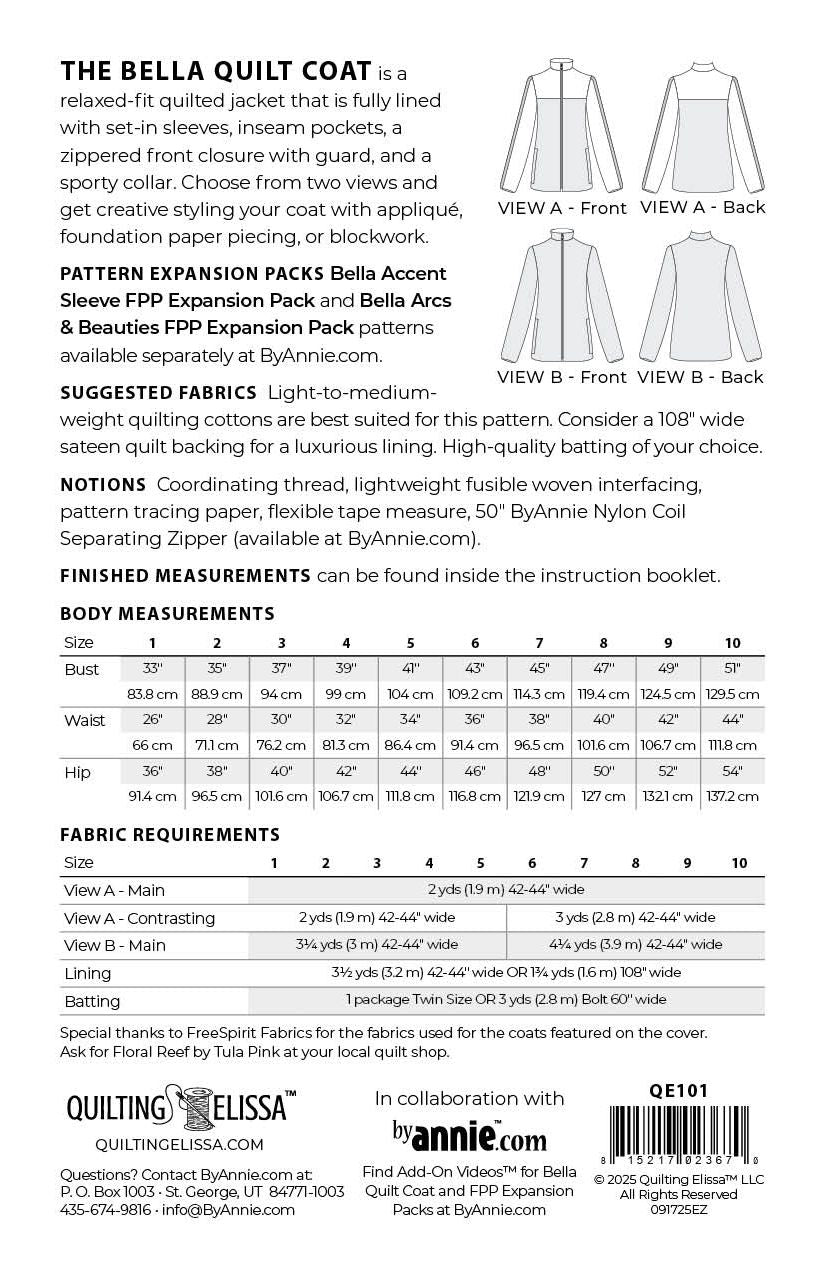 By Annie and Quilting Elissa - Bella Quilt Coat Ladies Paper Sewing Pattern - 10 sizes