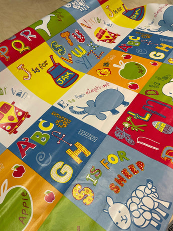 Oil cloth, perfect for table coverings. Water repellent, wipes clean.