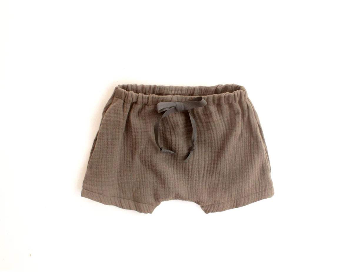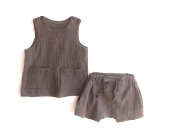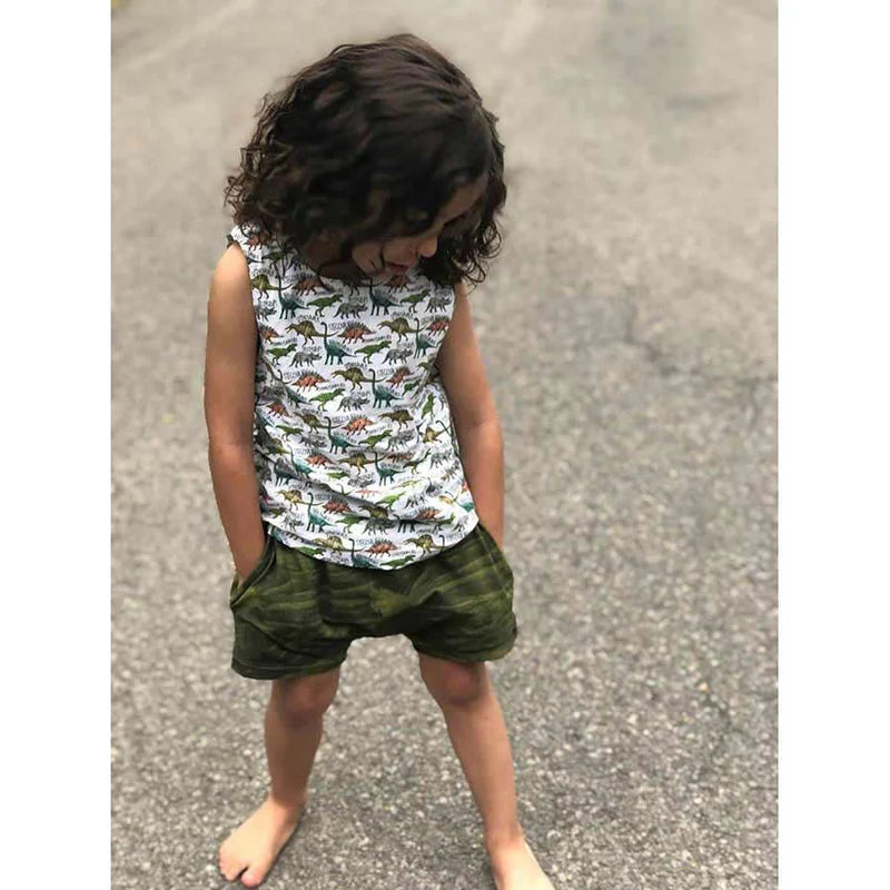 The Peppy Top and Shorts Pattern Bundle is a simple and trendy set designed for woven fabrics such as double gauze, linen, and other light to medium weight cottons. The harem shorts feature optional pockets and optional faux drawstring. The top features two front patch pockets or small chest pocket and easy facings for quick finishing. This summer pattern set is perfect for active children.