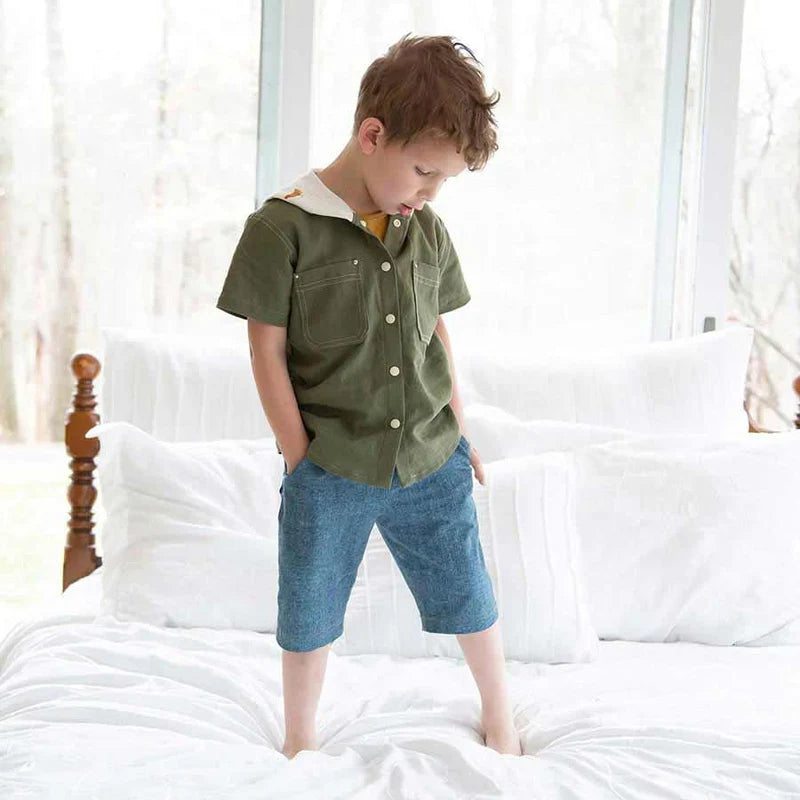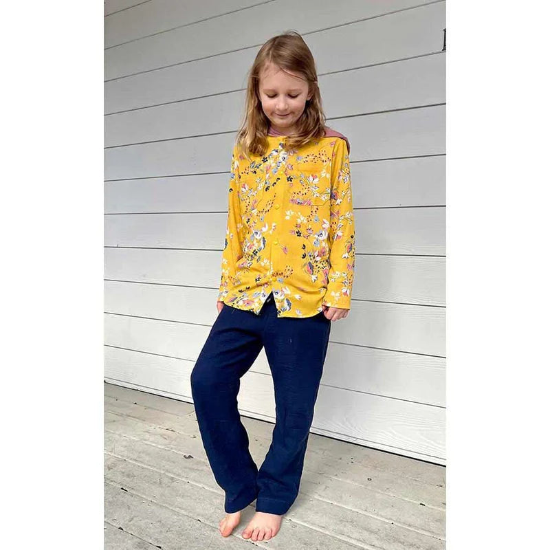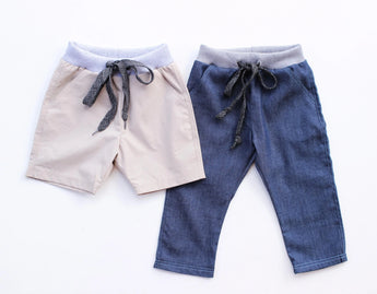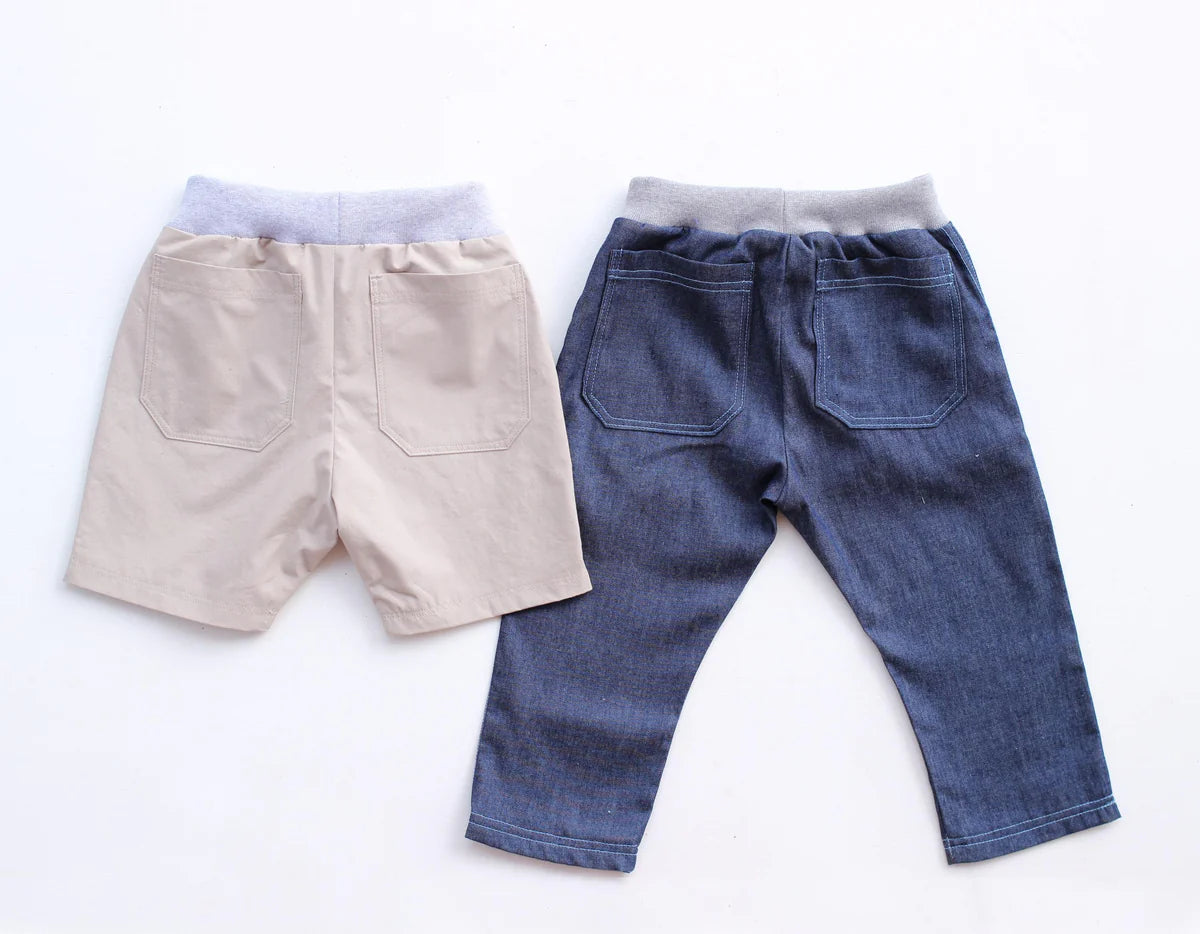 The Very Casual Shorts and Pants Pattern is a wardrobe staple and has been designed for the comfort of playing and running! The style has a regular fit in both pant and short versions, with the short hem falling below the knee. Features include back patch pockets, front pockets, and easy faux flat-felled seams. Designed for both woven and knit fabrics, and rib knit for the waistband. Include the optional functional drawstring if desired. Sew the Very Casual Shorts and Pants from a variety of fabrics including denim, French terry, needlecord, linen, and other stretch and non stretch fabrics!