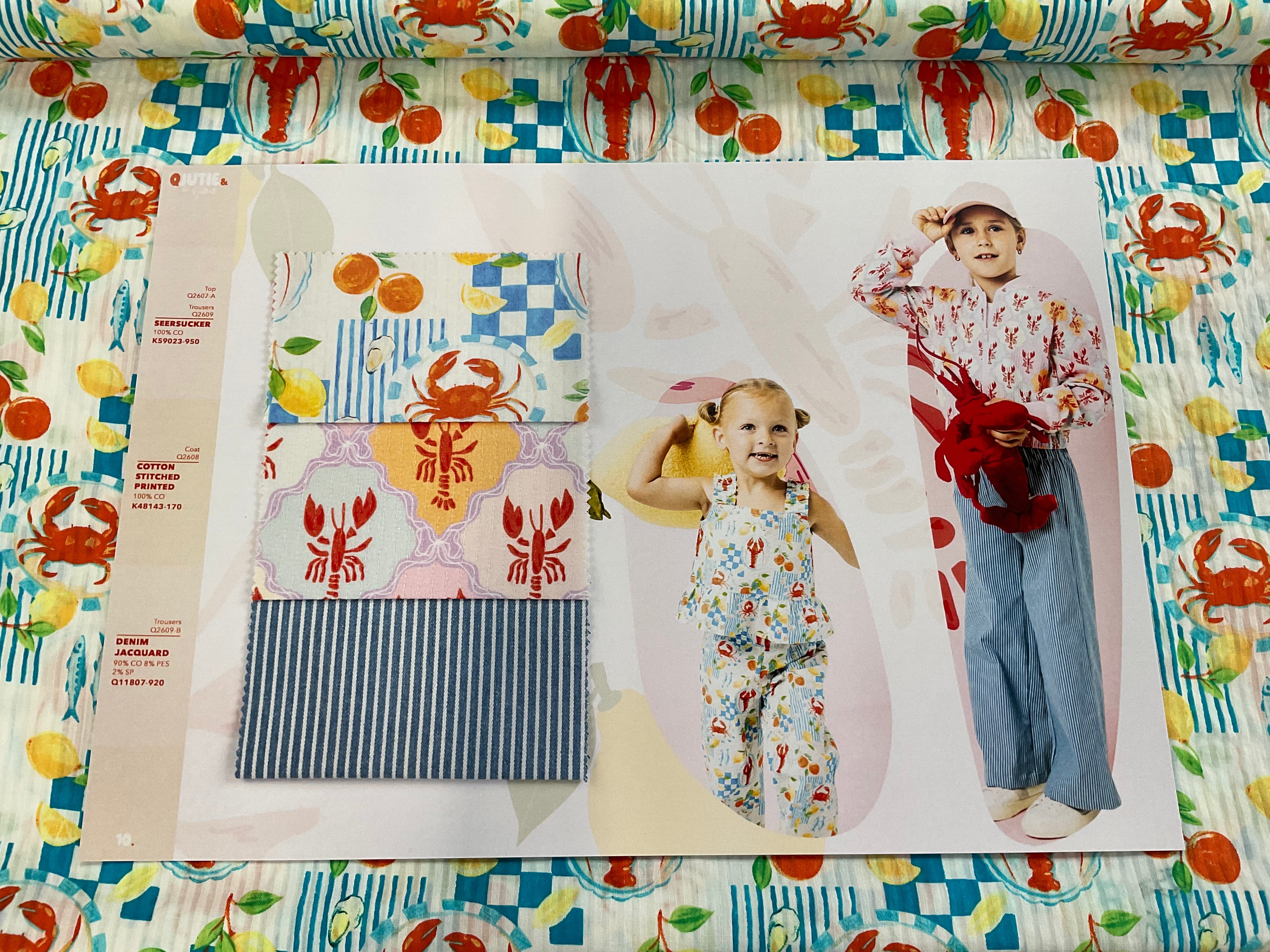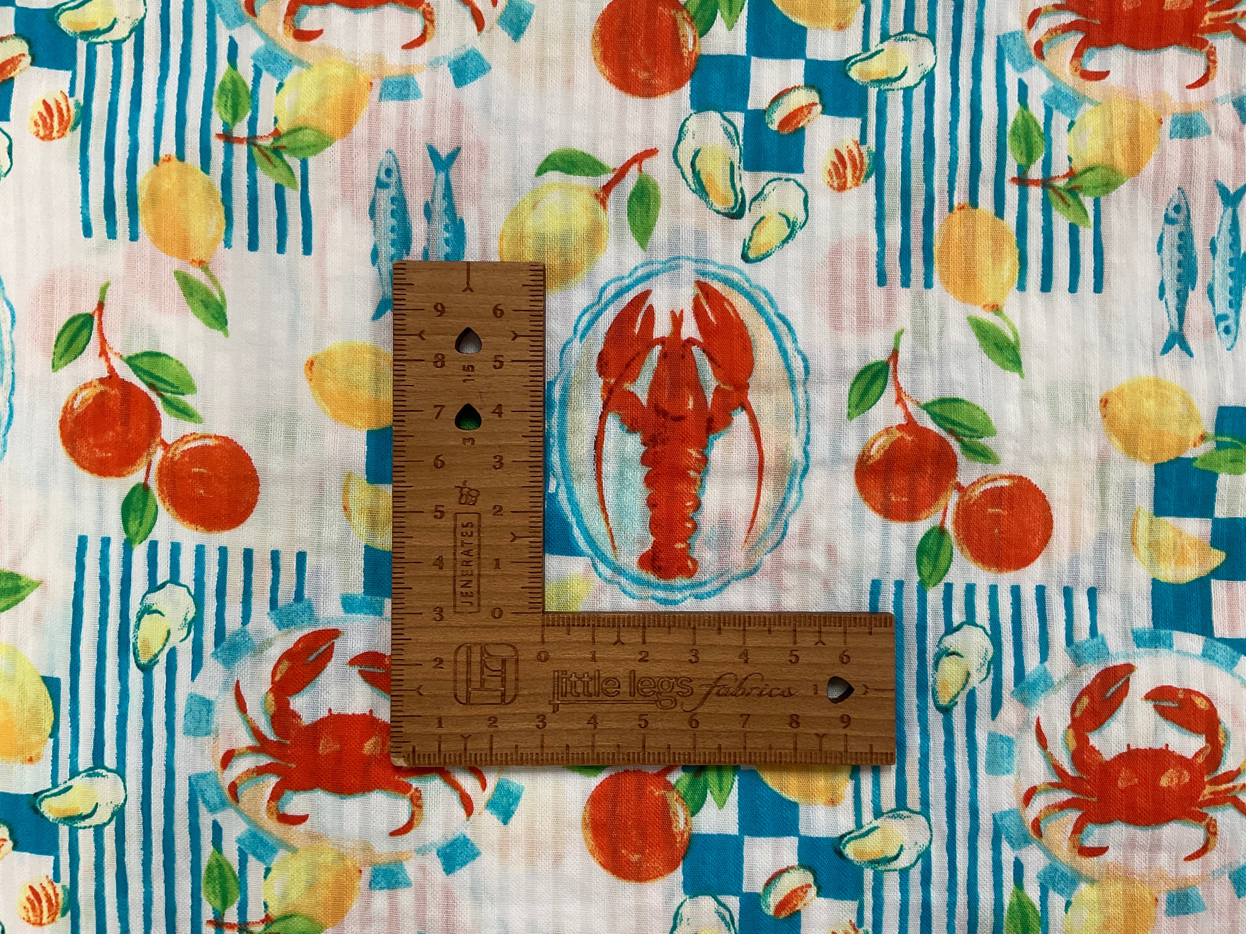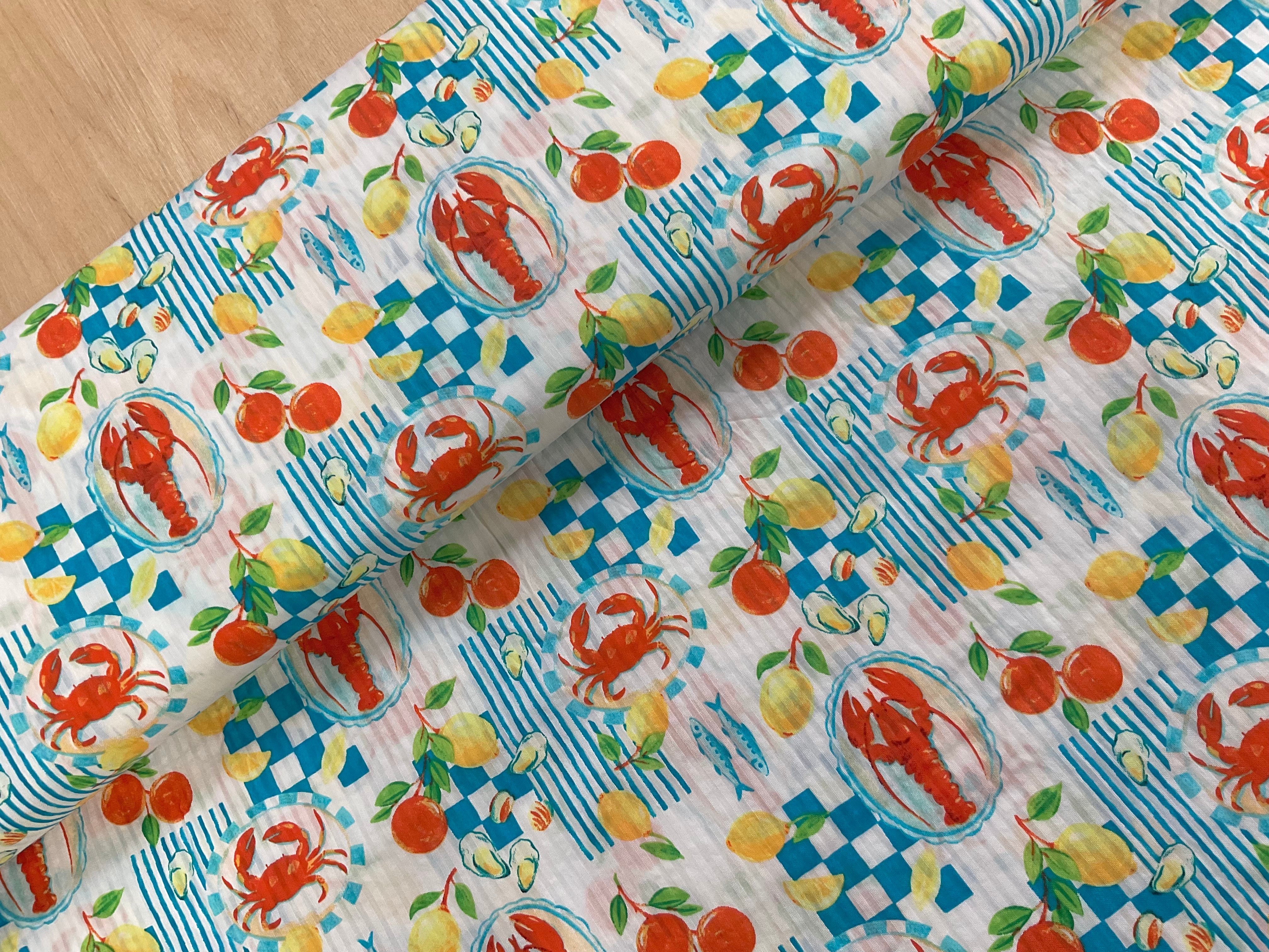 lightweight seersucker striped seafood themed cotton. Perfect for summer clothes