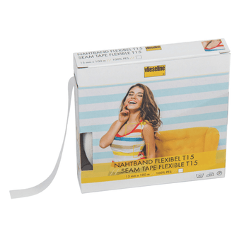 Lightweight, bi-elastic, bias-cut, fusible woven tape (Flexible T15). Perfect for seams in soft, elastic fabrics (e.g. jersey), prevents warping and fraying. Can easily be applied to curved shapes. Washable at 40 degrees centigrade on delicate cycle, moderate iron, dry cleanable.