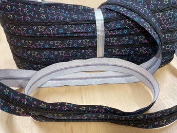 Rainbow Stars on Black with Black Teeth Continuous Zipper Tape