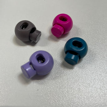 toggle made of plastic with a metal spring. Ideal for locking cord in place on bags, sweatshirts, joggers etc.