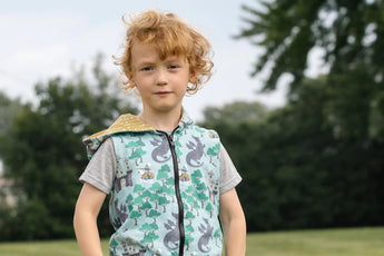 The Dragon Vest Pattern is a stylish and fully lined zippered vest for babies and children up to 10 years old. Features include contrasting band, hood, exposed zipper, and comfortable fit. Designed for knit fabrics such as French Terry, cotton jersey, interlock, sweat, and stretch fleece.