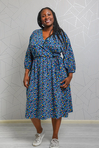 The Emporia Margot dress is a stretch sewing pattern for a faux wrap dress featuring a batwing bracelet length sleeve, elasticated waist and cuffs, ties at the waist, in-seam pockets and a subtly gathered skirt. Make it from cotton or viscose jersey for a casual feel, light weight French terry for a cosy winter dress, or elevate your look with luxe velour. Margot will see you through the colder months into spring with a comfy, easy to wear style. Dress her up for Christmas and the party season with velour or a bold printed scuba; you could even hack it with a stretch cotton or sateen!