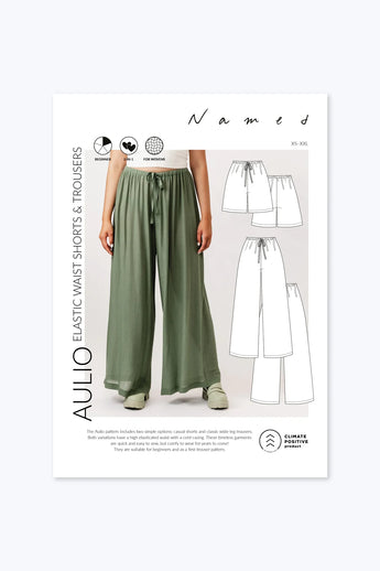 the Aulio Elastic Waist Shorts and Trousers sewing pattern from Named. The Aulio pattern includes two simple options: casual shorts and classic wide-leg trousers. Both variations have a high elasticated waist with a cord casing. These timeless garments are quick and easy to sew and comfy to wear!
