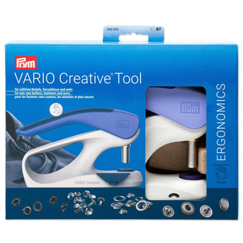 The VARIO Creative® Tool is compatible with all existing Prym tool sets from the non-sewing range. The low effort required and the effortless switching between the different functions enable fatigue-free and precise work with an assurance of success. The scale with longitudinal and transverse measurements is very practical for maintaining fixed distances on the fabric / material to be worked. Also included are punching tools from 2.5 to 4.0 mm.