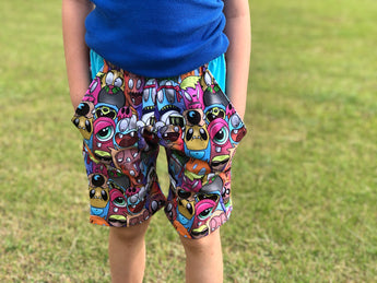 The Shoreline Shorts pattern is a simple but simply perfect kid shorts pattern. There are two lengths to choose from, optional pockets and an elasticated waist. The pattern is designed for medium weight knit fabrics such as French terry or sweatshirt fleece.
