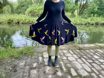 The Stephanotis pattern includes a slim fit t-shirt, peplum top and dress. There are two neckline options and three sleeve lengths to choose from. The sleeves can be hemmed or finished with cuffs. The skirt on the dress can be a half circle or full circle and (perhaps most importantly) you can add pockets!