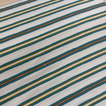 Teal/Mustard and copper stripes on White Cotton Jersey Fabric