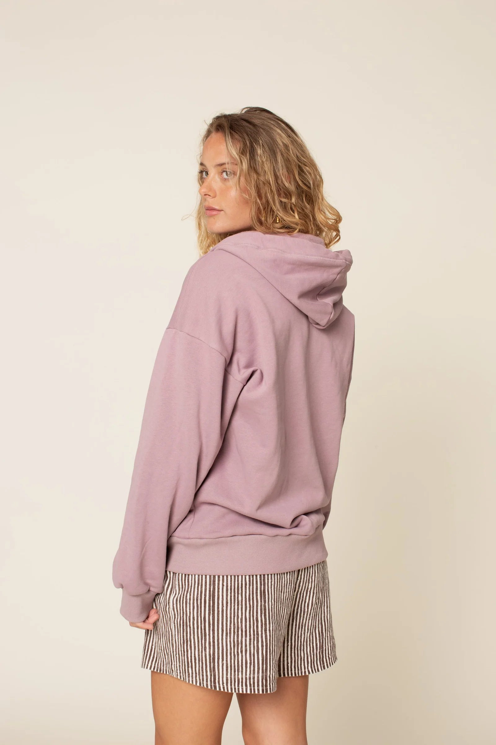 The Zipper Hoodie is a classic hooded sweatshirt with a front zipper. The shoulder seam is dropped and rotated forward. It has a kangaroo pocket, and the sleeves and hem are finished with ribbing. The pattern also includes the option to make a sleeveless version.