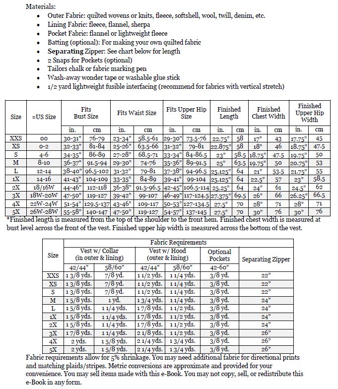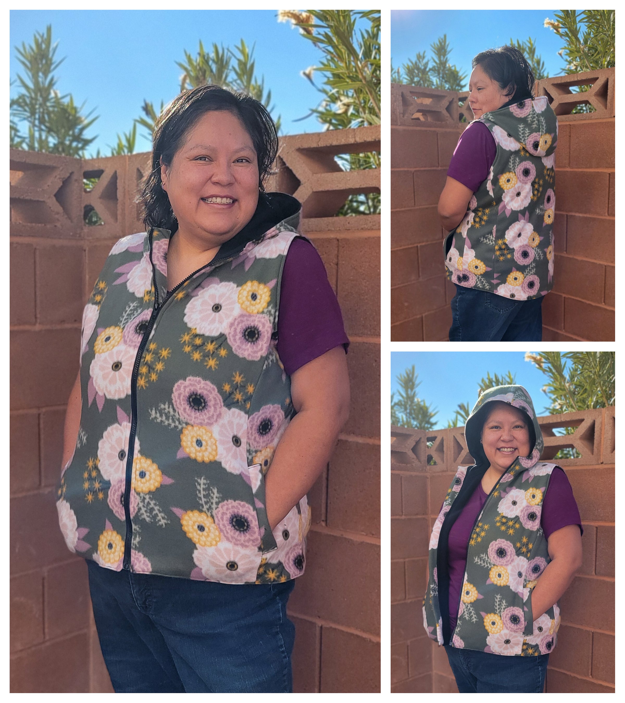 The Women's Wilderness Vest pattern features curved seams in front and back, optional pockets, your choice of hood or collar and an optional zipper shield. Suggested fabrics included quilted outerwear, fleece, wool, twill, sherpa and more.
